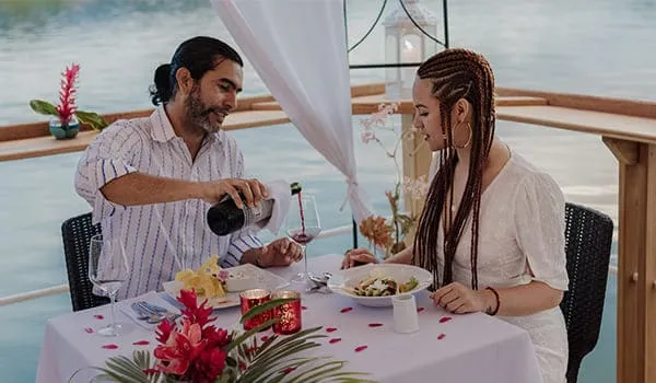 Una de las experiencias más maravillosas en la selva, disfruta de una cena en nuestras balsas flotantes. Incluye: cena de 3 tiempo, decoración con velas y flores. Balsa privada para la pareja.